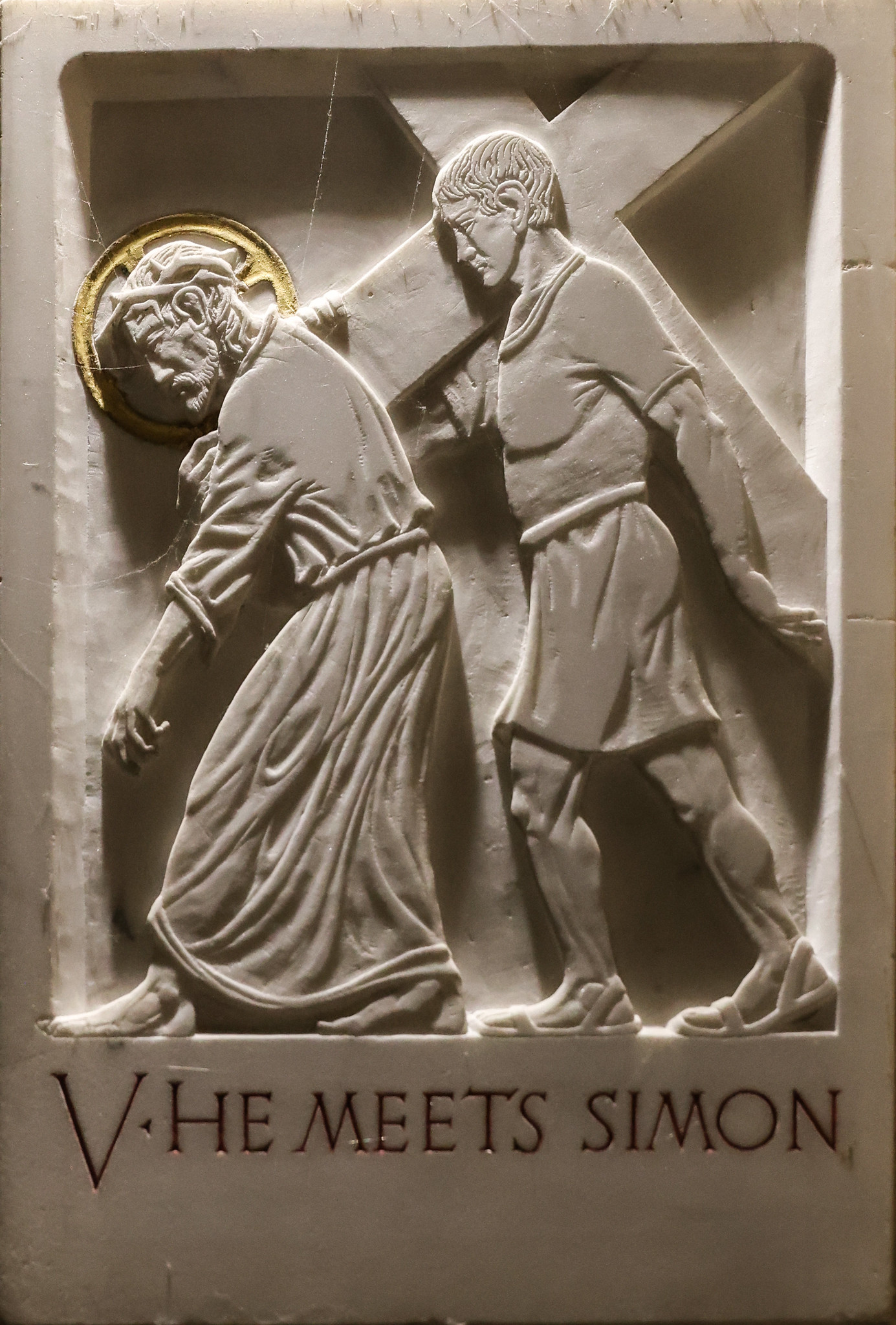 Image: 5th Station – Simon of Cyrene helps Jesus carry the Cross, by Aelred Whitacre OP in the Priory of the Holy Spirit (aka Blackfriars), Oxford. Photo credit: Fr Lawrence Lew OP